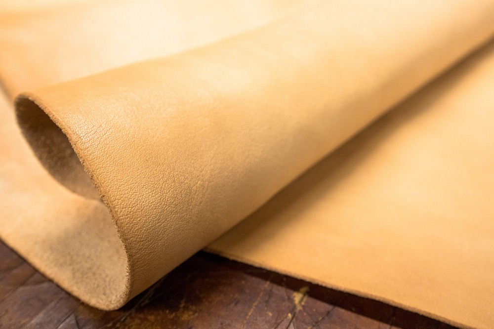石灰槽でゆっくり脱毛した後、ブラジル産のミモザの樹皮から抽出されたタンニンエキスで約20日間の時間をかけてじゅうぶんになめし込んだ栃木レザー社の地生ヌメ革に、染色加脂し、ドラムによるシュリンク加工(シボ出し加工)を施した革です。